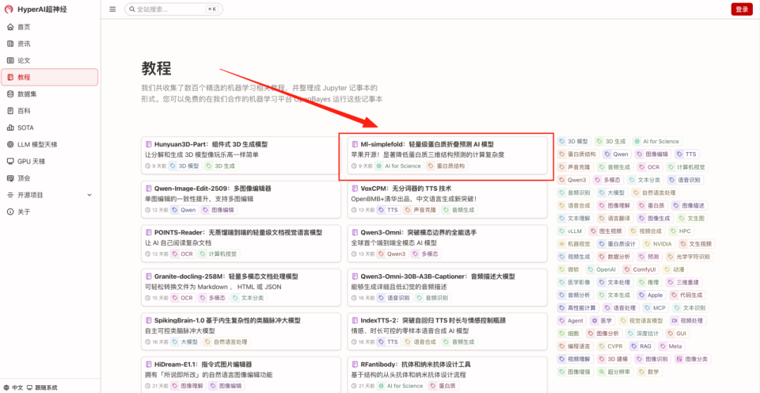 「Ml-simplefold:轻量级蛋白质折叠预测 AI 模型」现已上线 HyperAI 超神经官网(hyper.ai)的「教程」板块,一键运行即可体验最新的蛋白质生成工具~