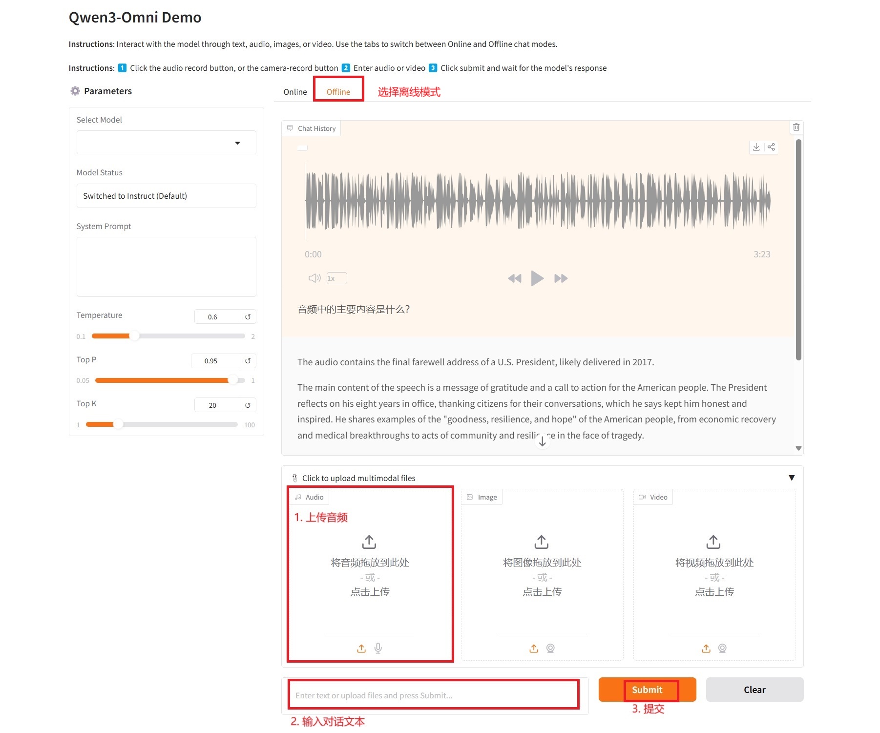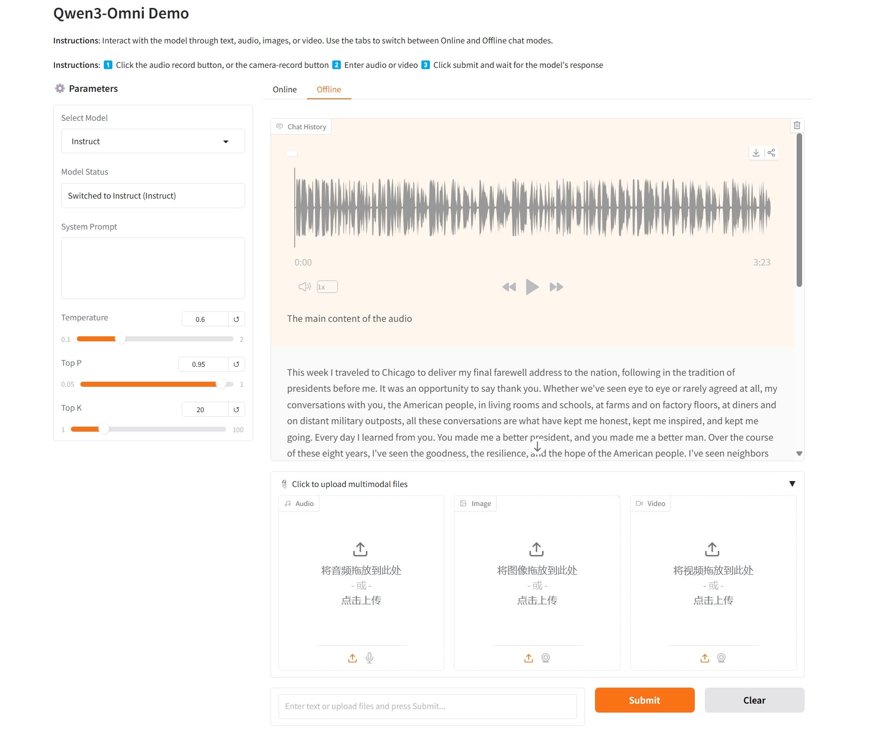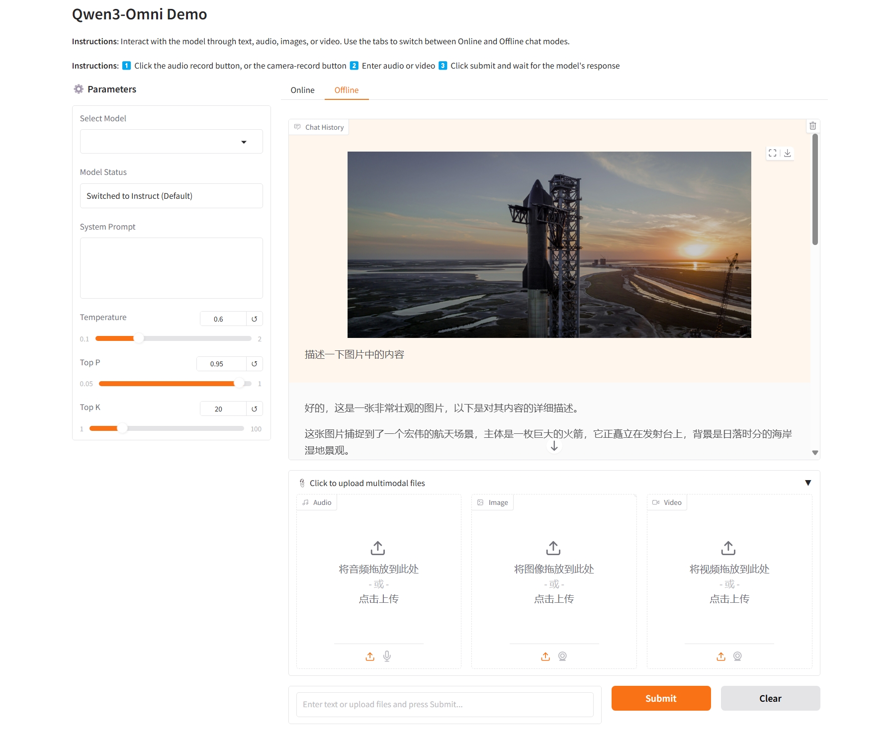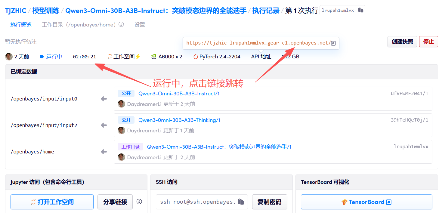 该教程算力资源采用双卡 RTX A6000,提供 Qwen3-Omni-30B-A3B-Instruct 和 Qwen3-Omni-30B-A3B-Thinking 两个模型供测试。