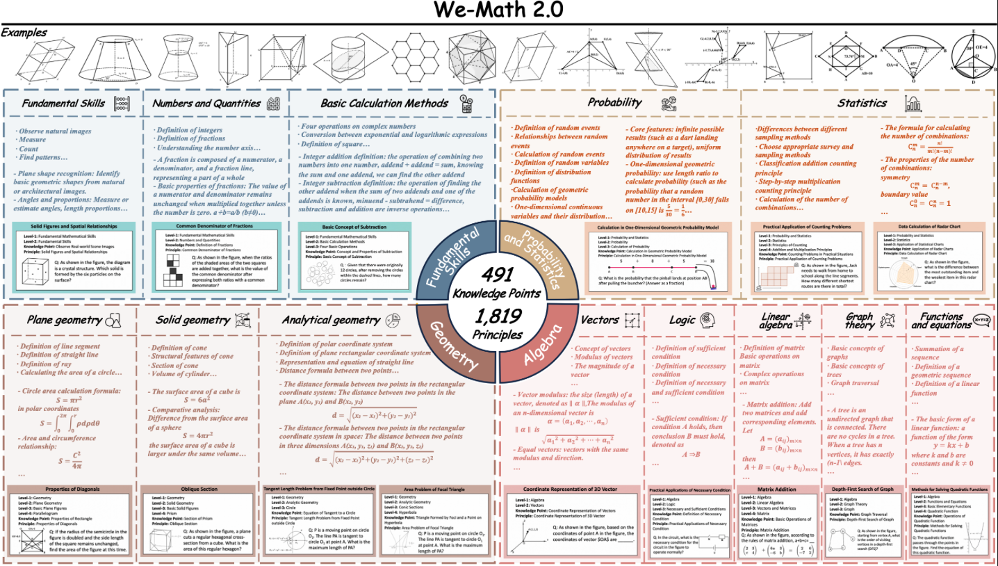 We-Math2.0-Standard is a standard dataset for visual mathematical reasoning released by Beijing University of Posts and Telecommunications, Tencent and Tsinghua University in 2025. The related paper results are "WE-MATH 2.0: A Versatile MathBook System for Incentivizing Visual Mathematical Reasoning", aims to provide a diagnosable, explainable and comparable evaluation basis.