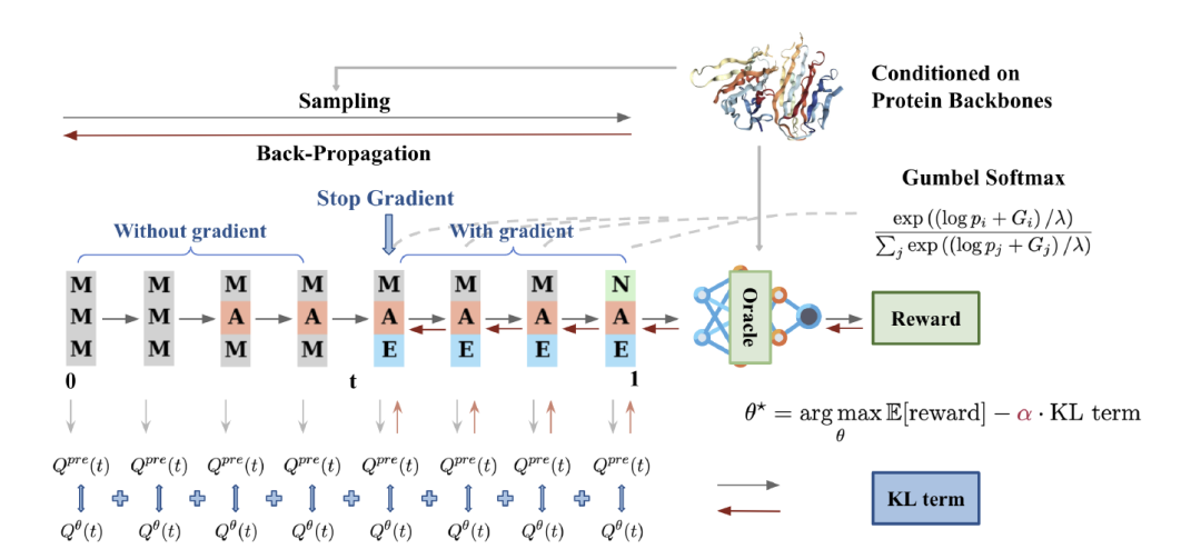 Specifically, DRAKES adopts a two-stage architecture, which is designed for the sampling process and the optimization process respectively. In the data sampling stage, the algorithm generates trajectories through a continuous time Markov chain (CTMC) and uses the Gumbel-Softmax technique to convert the discrete sampling process into a differentiable operation. This technique approximates the classification distribution through softmax, maintaining the sampling authenticity and retaining the gradient information under low temperature parameters.This design breaks through the limitation of non-differentiability in traditional discrete diffusion models.It provides a theoretical basis for subsequent optimization.