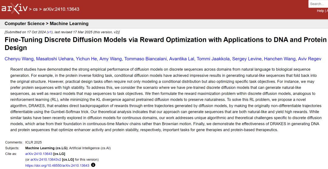 The related research results were selected for ICLR 2025 under the title "Fine-Tuning Discrete Diffusion Models via Reward Optimization with Applications to DNA and Protein Design".