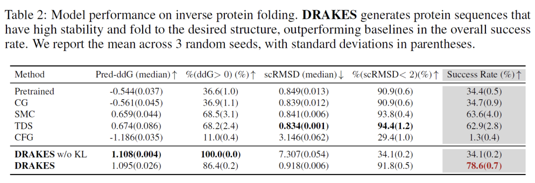 In the protein stability optimization task, the sequence generated by DRAKES achieved the optimal balance between predicted stability (Pred-ddG=-1.23 kcal/mol) and structural consistency (83% success rate of scRMSD<2). Comparative experiments show that although the version without KL regularization performs better in predicted stability (Pred-ddG=-1.45 kcal/mol), its structural consistency is significantly reduced (scRMSD<2 success rate is only 61%). Verified by PyRosetta physical simulation, the Gibbs free energy (ΔG=-15.2 kcal/mol) of the sequence generated by DRAKES under the target main chain structure is 21% lower than the baseline method, further confirming the physical rationality of its optimization results.