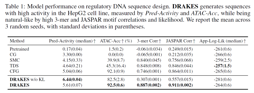 To verify the effectiveness of the DRAKES algorithm, the researchers conducted a comprehensive experimental evaluation in two key tasks: regulatory DNA sequence design and protein sequence design.Experimental results systematically demonstrate the ability of DRAKES to significantly optimize target properties while maintaining sequence naturalness.
