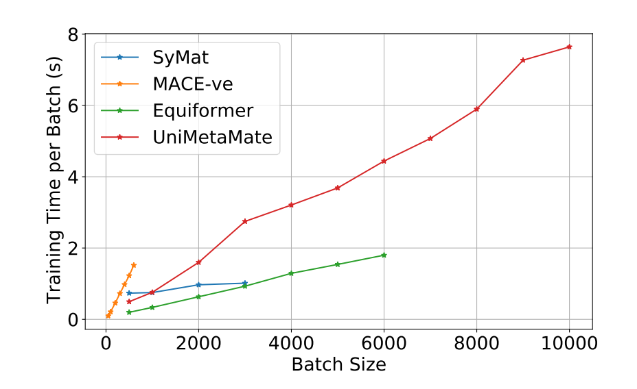 In terms of time efficiency, we train each model and record the average time to process each batch. The results show thatThe batch processing time of each model is roughly linear with the batch size.As shown in the figure below, the slope of the UNIMATE model is at a moderate level, indicating that it has a moderate level of time efficiency.