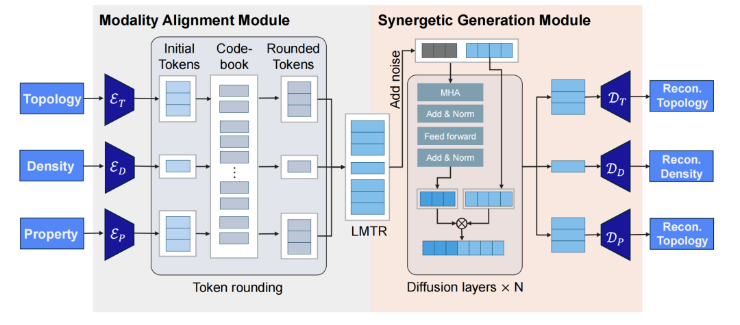 The goal of this module is to map three heterogeneous modalities (topology, density, mechanical properties) into a shared discrete latent space.Tripartite Optimal Transport (TOT) is used to align modal distributions, narrow inter-modal differences, and address data complexity challenges.