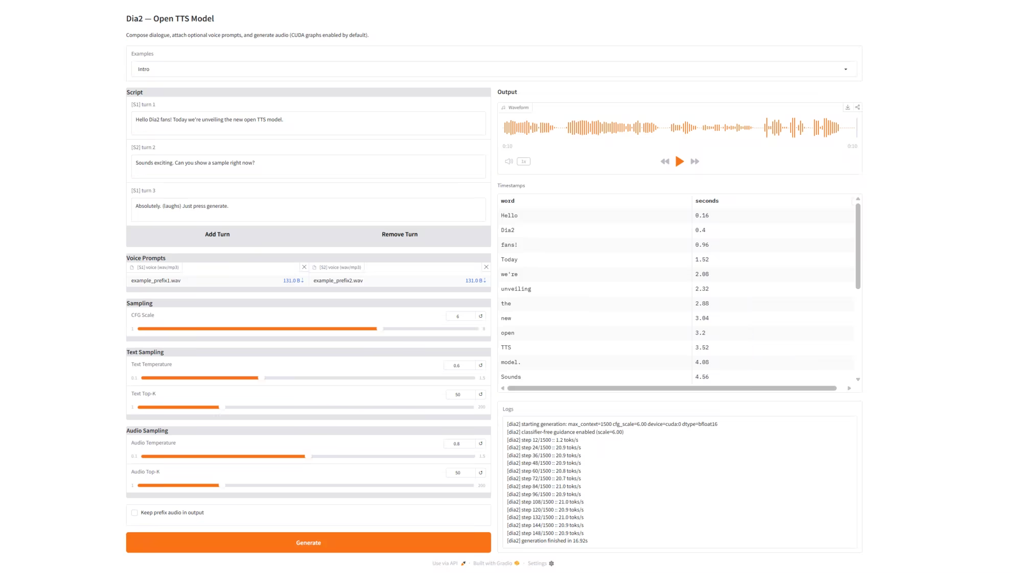 Dia2-TTS is a real-time speech synthesis service built on the Dia2 large-scale speech generation model (Dia2-2B) released by the nari-labs team. It supports multi-turn dialogue script input, dual-role voice prompts (Prefix Voice), and multi-parameter controllable sampling. It provides a complete web-based interactive interface through Grado for high-quality conversational speech synthesis. The model can directly input consecutive multi-turn dialogue scripts to generate natural, coherent, and consistent high-quality speech, suitable for applications such as virtual customer service, voice assistants, AI dubbing, and short drama generation.