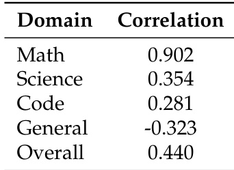 - Code domain exhibits unique evaluation criteria: metrics like Thinking Probability positively correlate (0.54) versus negative Math correlation (-0.69), necessitating domain-specific assessment frameworks.