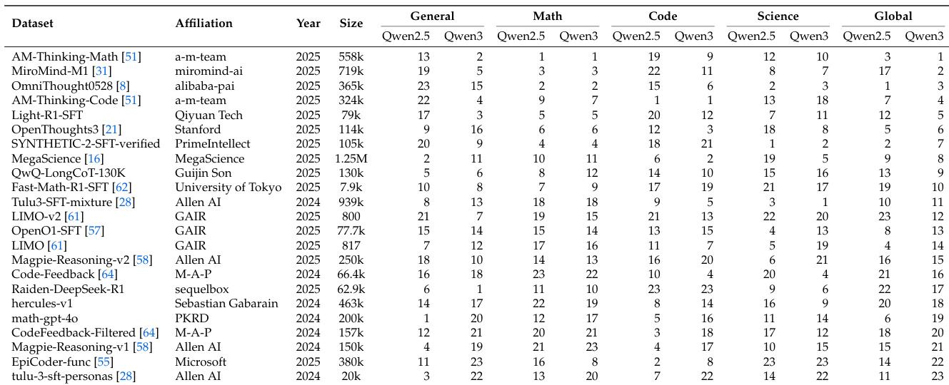 - Dataset rankings show high Math consistency (0.902 rank correlation between Qwen2.5/Qwen3) but General domain saturation (negative correlation: -0.323), indicating specialized domains benefit more from tailored data.
