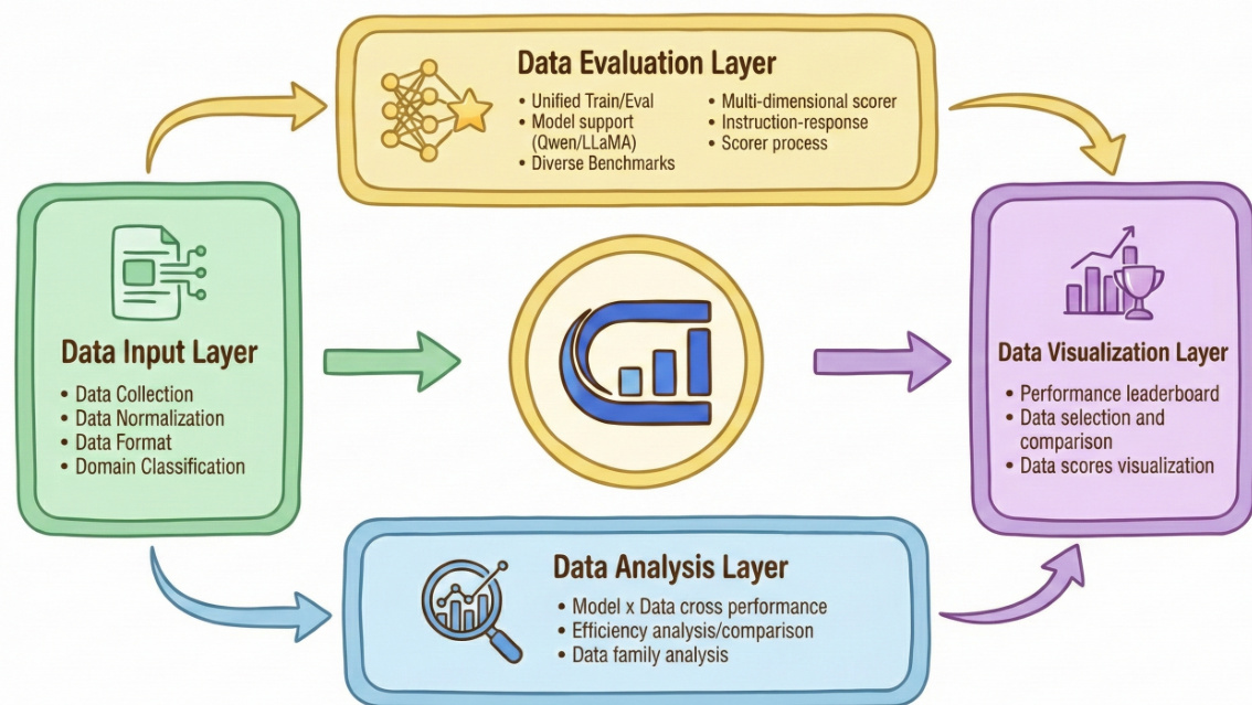 In the Data Evaluation Layer, each dataset is used to fine-tune a common pre-trained base model—such as Qwen or LLaMA—under a fixed training protocol. The resulting model is then evaluated across a diverse set of downstream benchmarks, with its aggregated performance serving as a proxy for the dataset’s intrinsic value. Concurrently, the layer executes a multi-dimensional scoring process that separately assesses the instruction (Q) and the full instruction-response pair (Q&A), capturing distinct facets of data quality. This scoring system leverages three methodological categories: model-based evaluation for quantifying complexity and reasoning depth, LLM-as-judge for subjective qualitative attributes like coherence and clarity, and heuristic rules for objective metrics such as token length or response structure.