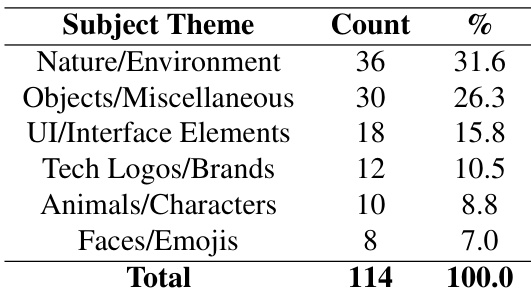 The authors analyze 114 animation instructions categorized by subject theme, with Nature/Environment being the most frequent at 31.6%, followed by Objects/Miscellaneous at 26.3%. UI/Interface Elements, Tech Logos/Brands, Animals/Characters, and Faces/Emojis make up the remaining categories, reflecting a diverse set of animation targets used in their evaluation.