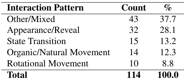 The authors analyze 114 animation interaction patterns generated by their method, finding that “Other/Mixed” patterns are most frequent at 37.7%, followed by “Appearance/Reveal” at 28.1%. Results show a diverse distribution across categories, with “Rotational Movement” being the least common at 8.8%.
