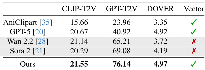 - Evaluated against AniClipart, GPT-5, Wan 2.2, and Sora 2 on instruction-following and perceptual quality metrics (CLIP-T2V, GPT-T2V, DOVER), achieving best scores across all benchmarks by enabling semantic part-aware motion in vector graphics.