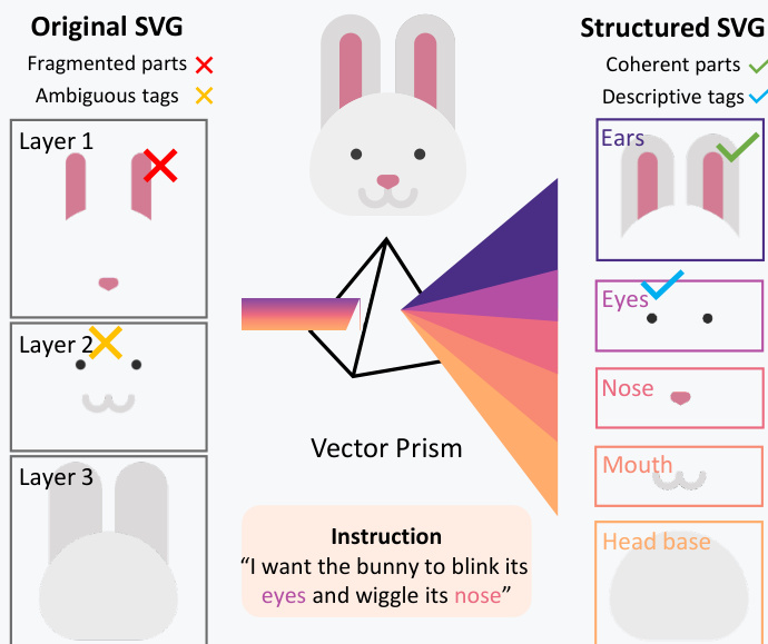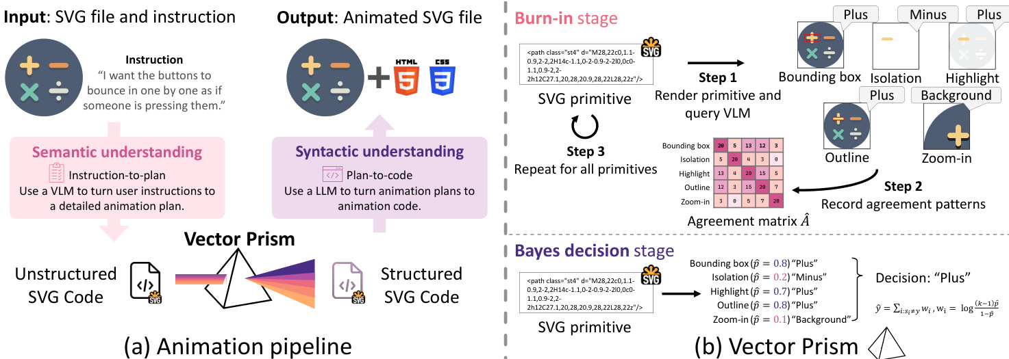 KAIST researchers introduce Vector Prism, a framework that automates Scalable Vector Graphics animation by recovering semantic structure through statistical aggregation of multiple weak part predictions, solving vision-language models' element fragmentation issues; this enables coherent animations via correct element grouping and achieves significant performance gains over prior approaches, unlocking robust and interpretable SVG interactions.