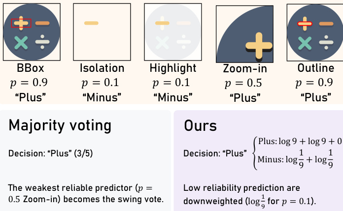 As shown in the figure below, Vector Prism takes each SVG primitive—such as , , or —and renders it through multiple focused views: bounding box, isolation, highlight, zoom-in, and outline. Each view provides a complementary visual cue to the VLM, which then assigns a tentative semantic label to the primitive. These labels are inherently noisy, as different rendering methods vary in reliability. For instance, a bounding box view might reliably identify a “Plus” symbol with p=0.9, while a zoom-in view might misclassify it with p=0.5.