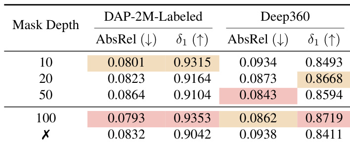 The authors evaluate the impact of different depth mask thresholds on model performance, finding that a 100 m threshold yields the best overall balance with the lowest AbsRel and highest δ1 on both DAP-2M-Labeled and Deep360. Removing the mask head degrades performance, confirming its role in stabilizing training and filtering unreliable far-depth predictions. Results show that smaller thresholds (10 m, 20 m) favor near-range accuracy, while the 100 m setting best preserves metric consistency across diverse scene scales.