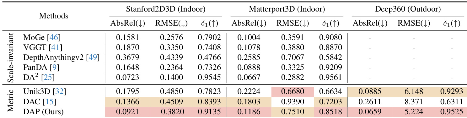 The authors evaluate DAP against scale-invariant and metric depth estimation methods on three benchmarks, showing that DAP achieves the lowest AbsRel and RMSE while attaining the highest δ1 across all datasets. Results indicate DAP outperforms prior metric methods like Unik3D and DAC, particularly in outdoor scenes on Deep360, where it reduces AbsRel to 0.0659 and δ1 reaches 0.9525. These improvements reflect DAP’s ability to deliver metrically consistent depth without post-alignment, generalizing robustly across indoor and outdoor panoramic environments.