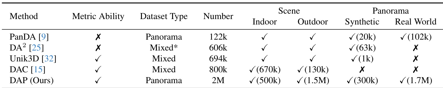 The authors introduce the DAP data engine, a unified dataset scaling to 2 million panoramas across synthetic/real and indoor/outdoor domains. Key components include: