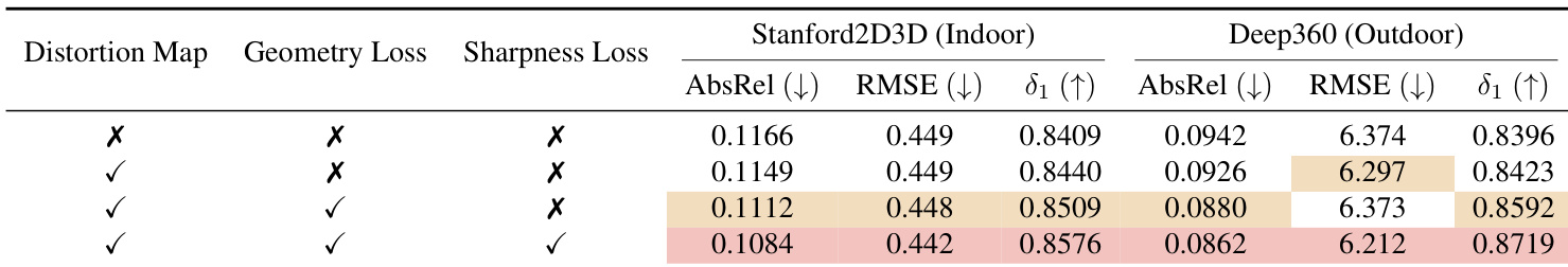 The authors use ablation studies to evaluate the impact of distortion maps, geometry losses, and sharpness losses on panoramic depth estimation. Results show that combining all three components yields the best performance, achieving the lowest AbsRel and highest δ₁ on both Stanford2D3D and Deep360 datasets. The inclusion of sharpness losses contributes most significantly to improved metric accuracy and structural fidelity.