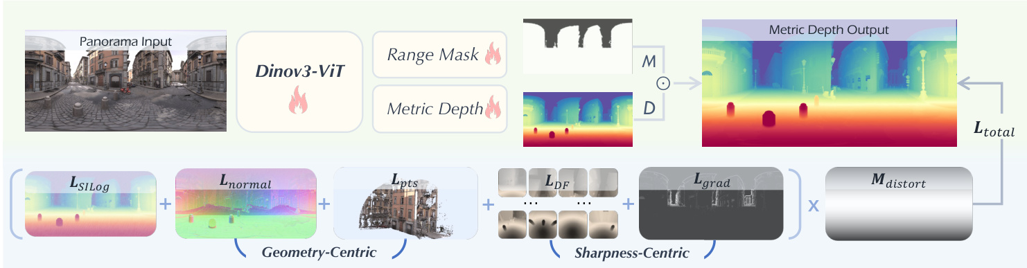 Ltotal=Mdistort⊙(λ1LSILog+λ2LDF+λ3Lgrad+λ4Lnormal+λ5Lpts+λ6Lmask),(ℓ=1,2,3,4,5,6).As shown in the architecture diagram, this multi-faceted optimization strategy ensures metric accuracy, edge fidelity, and geometric consistency across panoramic views.