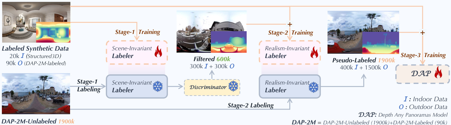 - Stage 2: Uses a PatchGAN discriminator to select 600K high-confidence pseudo-labeled samples (300K indoor/outdoor each) from DAP-2M-Unlabeled, bridging synthetic-real domain gaps.
