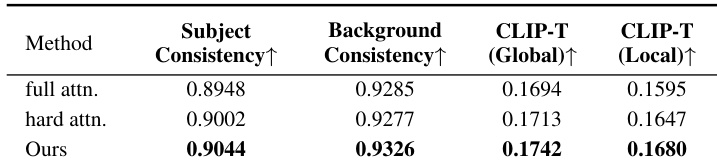 The authors evaluate their Spatial-Aware Weighted Cross-Attention mechanism against full and hard attention variants using consistency and semantic alignment metrics. Results show their method achieves the highest scores in both subject and background consistency, as well as global and local CLIP-T scores, confirming its effectiveness in aligning text with trajectories. This demonstrates that spatial weighting improves multi-agent event generation by preserving semantic and visual fidelity.