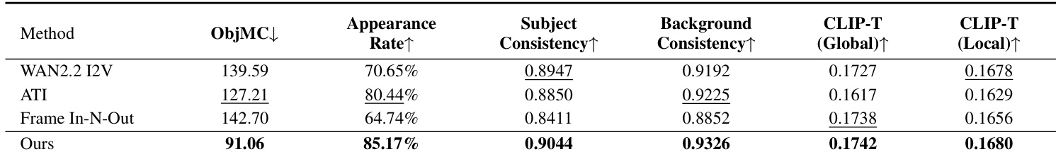 - Outperformed Wan2.2 I2V, ATI, and Frame In-N-Out on a custom benchmark of 100 image-trajectory pairs, achieving ObjMC 1.82 (vs. baselines 2.15–2.38), Appearance Rate 94.3% (vs. 89.7%–92.1%), and CLIP-T 0.31 (vs. 0.26–0.28), demonstrating superior trajectory following and semantic alignment.