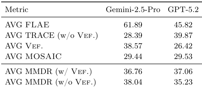 The authors use a multimodal evaluation framework to assess Deep Research agents, with results showing that Gemini-2.5-Pro achieves higher scores than GPT-5.2 across most metrics, particularly in AVG FLAE and AVG MMDR with VEF. inclusion. GPT-5.2 performs better in AVG TRACE and AVG MMDR without VEF., indicating stronger evidence quality but lower visual fidelity, while Gemini-2.5-Pro maintains more consistent multimodal alignment and overall performance.