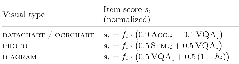 The authors use a normalized scoring system for visual items in the MOSAIC evaluation, where the score for each visual type is computed as a weighted combination of a feature score and a quality metric. For datacharts and ocrcharts, the score is based on accuracy and visual quality, while for photos it combines semantic and visual quality, and for diagrams it balances visual quality with a binary indicator of structural correctness.