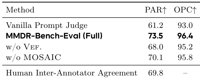 - Human evaluation (12 experts, 140 tasks) confirmed evaluator alignment: full system outperformed vanilla judges; VEF. and MOSAIC improved human consistency (PAR/OPC metrics).