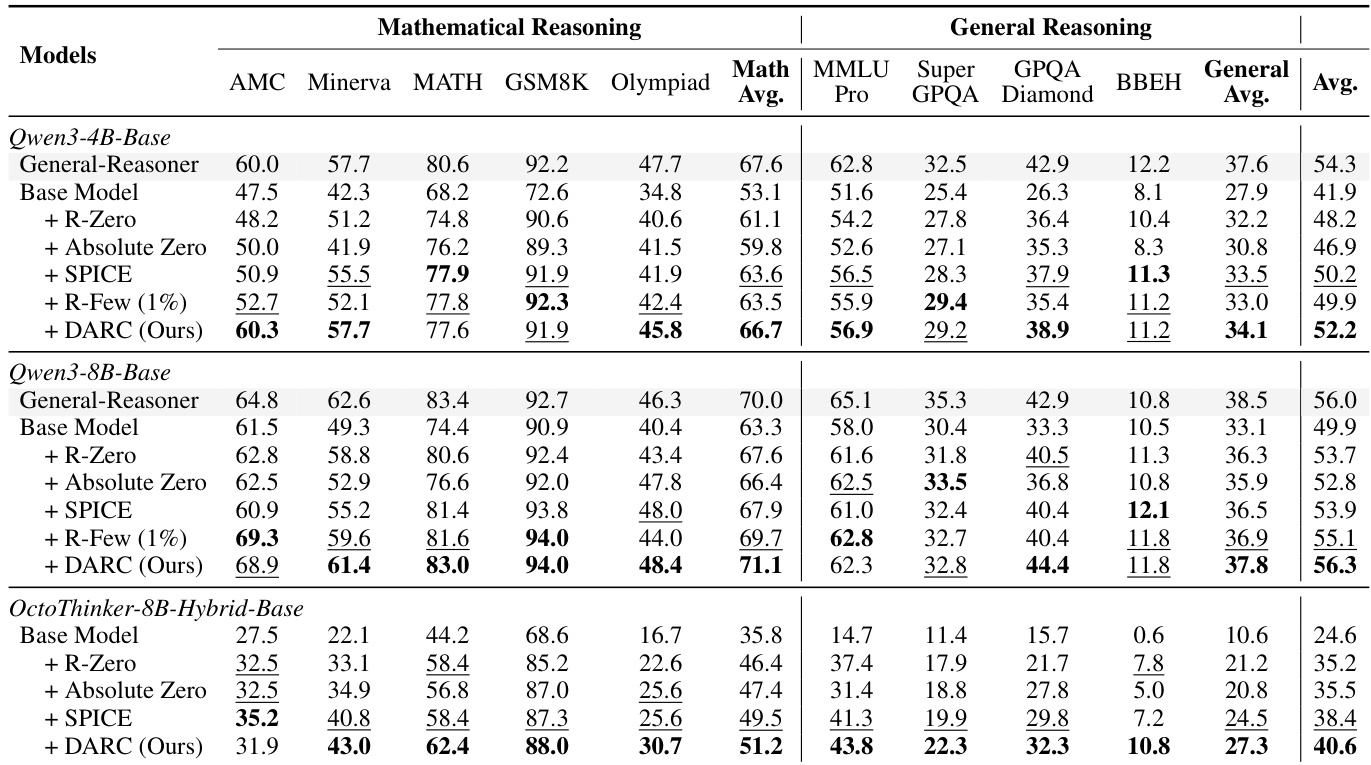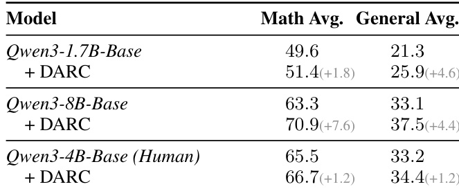 The authors use DARC to evaluate its effectiveness on different model scales, showing that it consistently improves performance across all backbones. Results show that DARC achieves significant gains on both mathematical and general reasoning benchmarks, with the largest improvements observed on smaller models like Qwen3-1.7B and Qwen3-4B, where it outperforms the base models by 1.8 and 1.2 points in math and general reasoning, respectively.