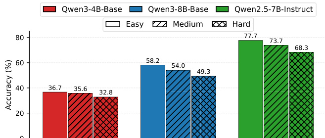 The authors use a trained Questioner to generate questions of varying difficulty levels and evaluate the resulting Solver accuracy across different model scales. Results show that Solver accuracy decreases monotonically from Easy to Hard across all models, indicating that the Questioner learns a solver-agnostic and input-driven difficulty partition.