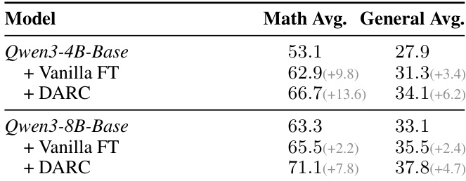 The authors use DARC to improve reasoning performance on mathematical and general benchmarks, showing that DARC consistently outperforms base models and label-free baselines across both Qwen3-4B and Qwen3-8B backbones. Results show that DARC achieves higher average scores than Vanilla FT on both math and general reasoning, with larger gains on the 8B model, indicating that DARC more effectively transfers reasoning capabilities beyond simple corpus memorization.