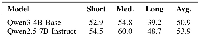 The authors compare the performance of Qwen3-4B-Base and Qwen2.5-7B-Instruct on reasoning tasks across different document lengths, with Qwen2.5-7B-Instruct achieving higher scores in short and medium contexts while both models show lower performance in long contexts. Results indicate that instruction tuning improves reasoning ability, particularly in shorter contexts, but gains diminish as document length increases, likely due to noise from excessive information.