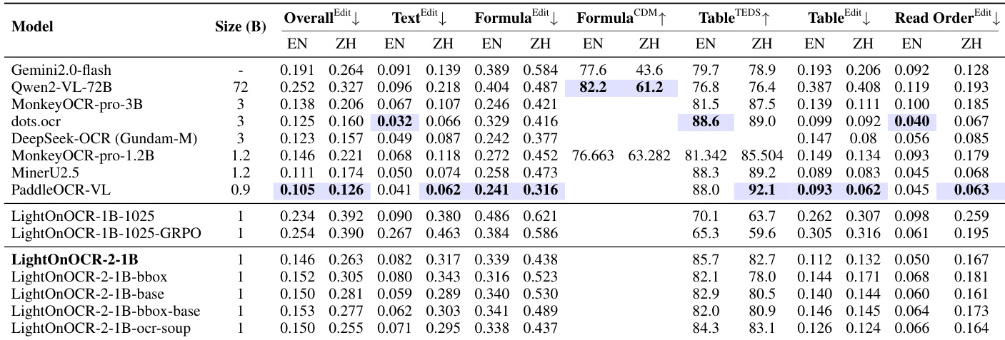 - LightOnOCR-2-1B achieved 83.2 ± 0.9 on OlmOCR-Bench (excluding headers/footers), outperforming larger models despite 1B parameters; strong gains on ArXiv, math scans, and tables.