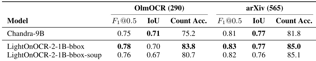 Results show that LightOnOCR-2-1B-bbox achieves higher F₁@0.5 and count accuracy than Chandra-9B on both OlmOCR and arXiv subsets, while maintaining comparable mean IoU, indicating improved detection of image presence and number with accurate localization. The bbox-soup variant slightly reduces performance compared to the base model but retains strong OCR quality.