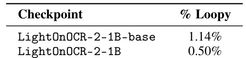 Results show that applying RLVR reduces the fraction of loopy generations in LightOnOCR-2-1B, with the base checkpoint exhibiting 1.14% loopy outputs and the RLVR-optimized version dropping to 0.50%. This indicates that the reinforcement learning process effectively mitigates repetition loops in model outputs.