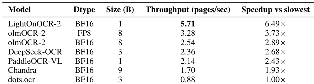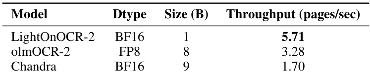 Results show that LightOnOCR-2 achieves a throughput of 5.71 pages per second, significantly outperforming olmOCR-2 and Chandra, which achieve 3.28 and 1.70 pages per second respectively, demonstrating its superior inference efficiency on a single NVIDIA H100 GPU.