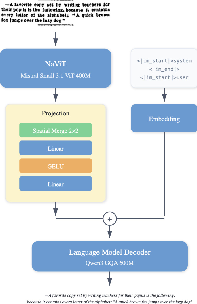 The authors leverage a modular vision-language architecture for LightOnOCR, designed to perform optical character recognition without requiring task-specific prompts at inference. The framework consists of three primary components: a vision encoder, a multimodal projector, and a language model decoder. The vision encoder, based on a native-resolution Vision Transformer, is initialized from the pretrained Mistral-Small-3.1 vision encoder weights. This choice enables the model to process variable image sizes while preserving spatial structure, which is essential for handling documents with diverse aspect ratios and fine typographic details.