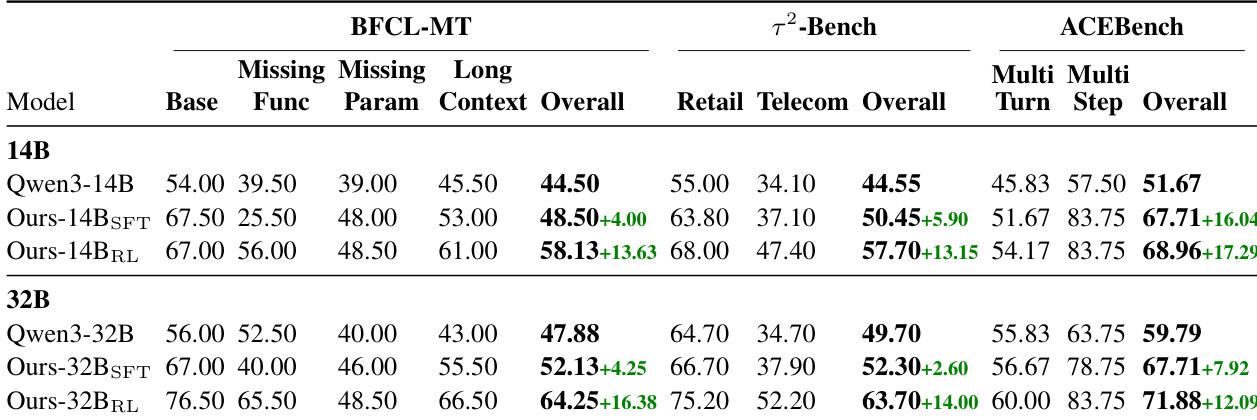 - Evaluated on agentic benchmarks (BFCL-MT, τ²-Bench, ACEBench) requiring multi-turn tool use and user simulation, plus non-agentic math benchmarks (AIME2024/2025) to assess core reasoning.