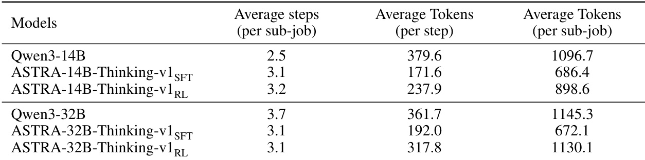 The authors observe that while fine-tuning stages do not significantly alter the average number of interaction steps per subtask, they substantially reduce token usage per step, with the RL stage producing outputs of intermediate length between the original and SFT models. This suggests that performance gains stem from more efficient reasoning and tool-use patterns rather than changes in dialogue depth. The RL-trained models maintain higher token efficiency per subtask compared to the base models, indicating improved conciseness without sacrificing task coverage.
