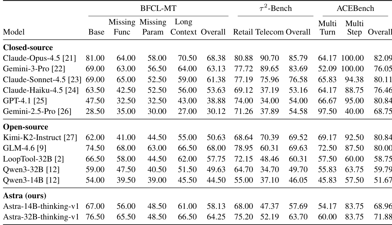 - Evaluated on agentic benchmarks including BFCL v3, ASTRA-trained models achieve state-of-the-art performance at comparable scales, rivaling closed-source systems while maintaining core reasoning capabilities, with all pipelines and models publicly released.
