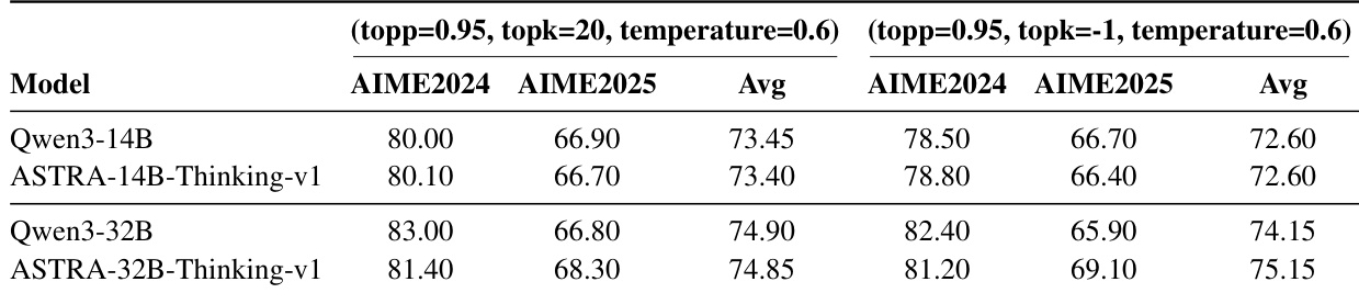 The authors evaluate their ASTRA models on non-agenetic mathematical reasoning benchmarks AIME2024 and AIME2025 under two decoding settings, showing that performance remains stable or slightly improves after training, with no significant degradation despite the focus on agentic tool use. Results indicate that the 32B variant consistently outperforms the 14B variant, and both ASTRA versions maintain competitive scores across both decoding configurations.