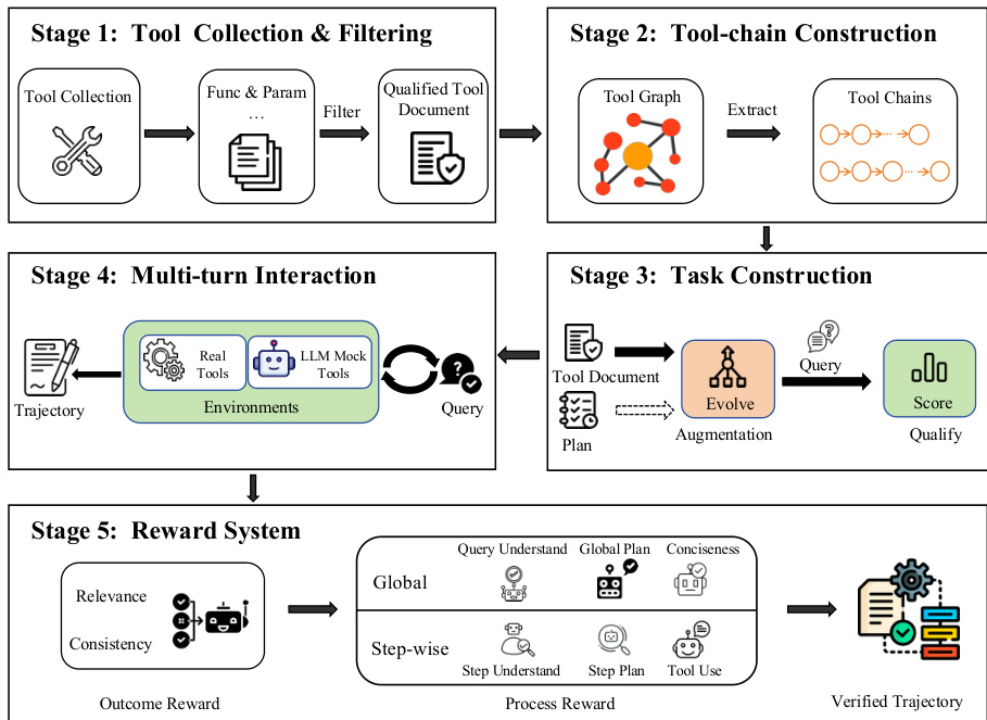 For SFT, the pipeline begins with tool document collection and normalization, followed by tool-chain synthesis and validation. As shown in the framework diagram, the process is structured into five sequential stages. Stage 1 involves filtering raw tool specifications into qualified documents by extracting function names and parameter schemas. Stage 2 constructs a directed transition graph from synthesized tool-chains, where nodes represent tools and edges denote valid consecutive invocations. Candidate chains are sampled via length-bounded random walks over this graph, biased by edge weights derived from prior synthesis frequency. Stage 3 generates task-conditioned queries paired with these chains, using an LLM to evolve plausible user intents and validate their coherence. Stage 4 executes multi-turn interactions using Qwen-Agent, integrating both real MCP servers and stateful emulators for doc-only tools. The emulator injects 20% failure rates to simulate real-world unreliability. Finally, Stage 5 applies a multi-dimensional reward model to assess trajectory quality across seven axes: query understanding, planning, tool-response context understanding, tool-response context-conditioned planning, tool call status, tool conciseness, and final answer quality. These scores are averaged into a single scalar reward for SFT signal generation.