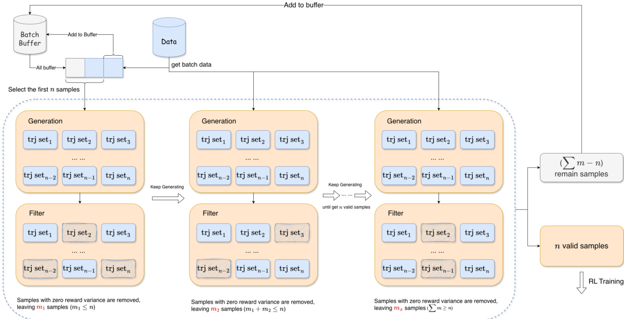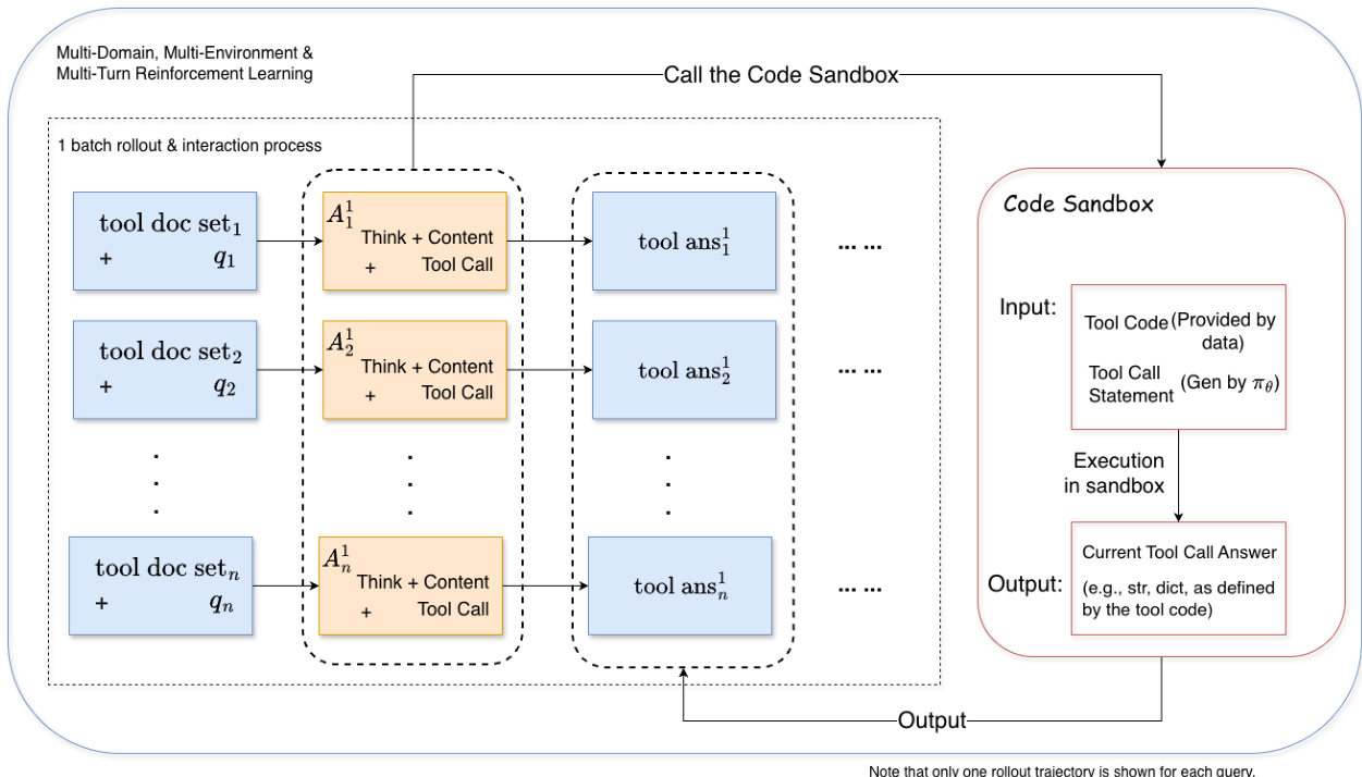 The RL training infrastructure implements an online, multi-turn agentic paradigm. At each step, the policy model generates a tool invocation statement, which is executed in a code sandbox alongside its corresponding tool implementation. The sandbox returns the tool output, which is fed back as an observation to condition subsequent decisions. The interaction terminates upon reaching a maximum turn limit, sequence length, or when the model ceases tool calls. The resulting trajectory is used for policy optimization via a modified GRPO objective that omits KL and entropy terms for stability. To mitigate training instability from degenerate reward variance, the authors introduce Adaptive Batch Filling: a strategy that maintains a buffer of valid rollouts (those with non-zero reward variance) and selects the first n valid samples for each optimization step, ensuring dense gradient signals. The reward function is F1-style, defined as the harmonic mean of sub-task recall r=n^/n and tool usage precision p=n^/(c+ϵ), where n^ is the number of solved sub-tasks and c is the total tool calls. This design incentivizes both task completion and interaction efficiency.