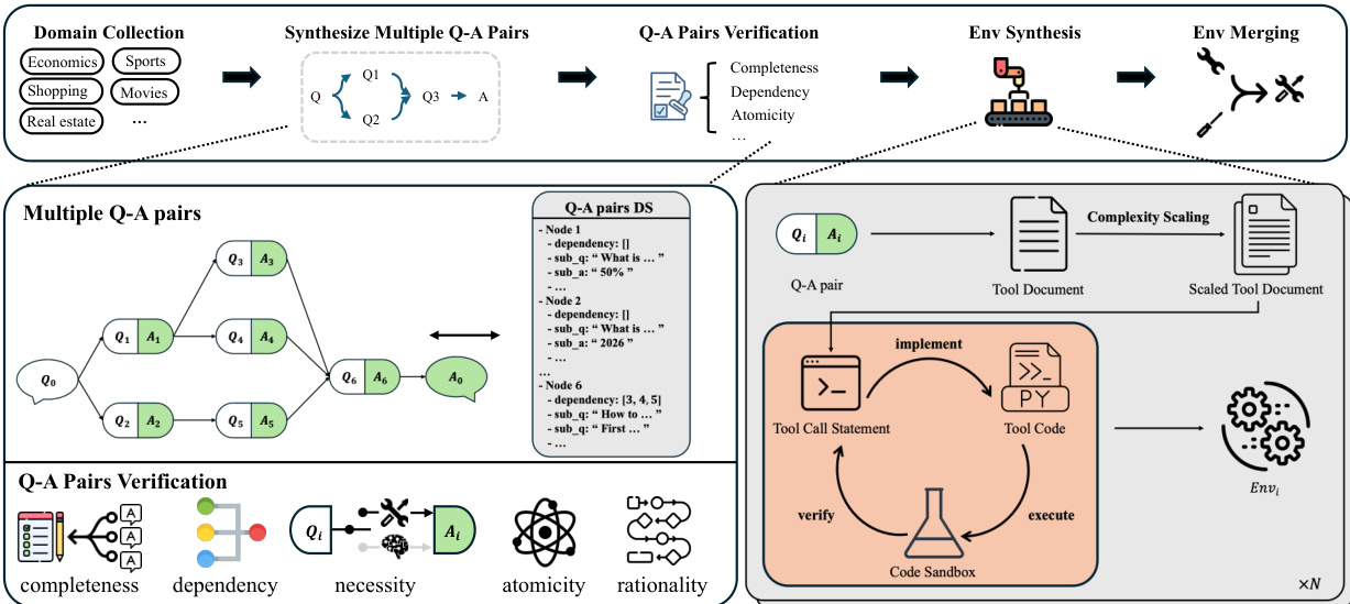For RL, the authors adopt a QA-based environment synthesis framework that models multi-turn tool use as navigation over a latent semantic topology. As illustrated in the figure below, the pipeline comprises four stages: Q-A instance synthesis, quality validation, environment synthesis, and sub-environment merging. In Stage 1, the system generates a main question q0 and its answer a0, along with a set of intermediate sub-questions S={(qi,ai)}i=1m that form a dependency graph G, such that a0=Φ({ai},G). Synthesis is conditioned on a knowledge source K and a hop budget H, operating in either question-conditional or unconditional mode. Stage 2 validates each decomposed instance across four dimensions: dependency consistency (ensuring each sub-question’s dependencies are logically necessary), sub-question atomicity (verifying indivisibility), sequential rationality (checking execution order validity), and task completeness (confirming sufficiency to solve q0). The overall quality score QS(τ) is the mean of these four binary indicators. Stage 3 synthesizes executable sub-environments for each non-leaf sub-task node by generating tool specifications, augmenting their complexity, and implementing Python-based tool code validated in a sandbox. Stage 4 merges functionally equivalent sub-environments by identifying homogeneous sub-questions and expanding their underlying data structures to support multiple parameter variants while preserving correctness.