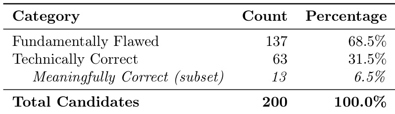 - Human evaluation revealed that 68.5% of 200 graded responses were fundamentally flawed, highlighting the high cost of verifying AI output, including debugging errors and checking for literature overlap or unintentional plagiarism.