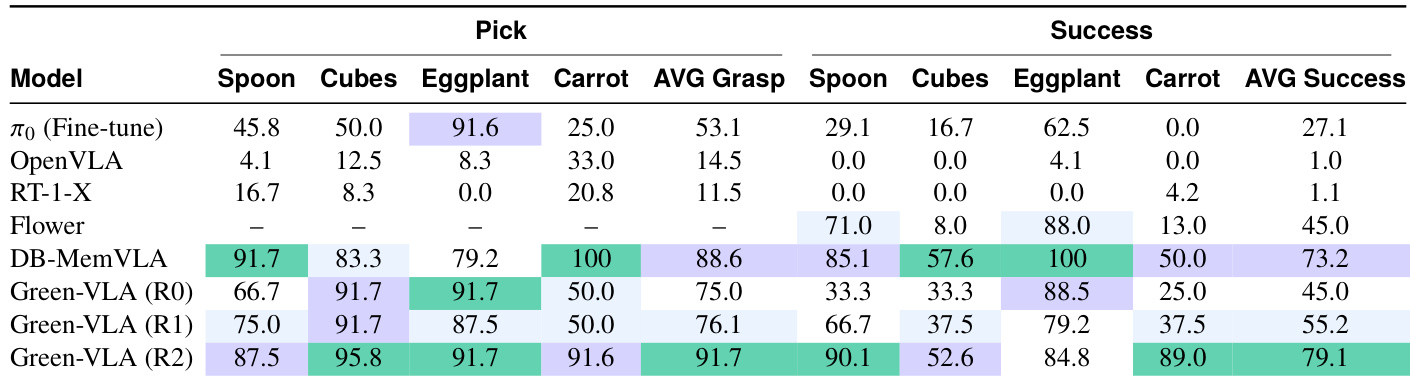 The authors evaluate Green-VLA across training phases R0, R1, and R2, showing progressive gains in both pick accuracy and task success across diverse objects. Results show that R2 RL alignment delivers the largest performance boost, particularly in success rate, outperforming prior models including fine-tuned baselines. Green-VLA consistently improves with each stage, demonstrating that staged training enhances both precision and robustness in manipulation tasks.