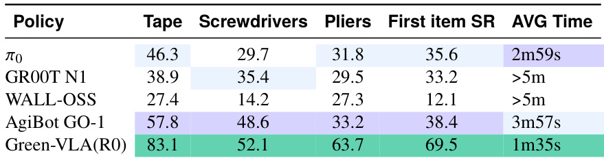 The authors evaluate Green-VLA against several baselines on object picking and table-cleaning tasks, finding that it achieves higher success rates and faster execution times across multiple object categories. Results show Green-VLA outperforms prior models even without embodiment-specific fine-tuning, indicating strong generalization from multi-embodiment pretraining. The model’s efficiency and accuracy improvements are consistent across both single-item and full-task scenarios.