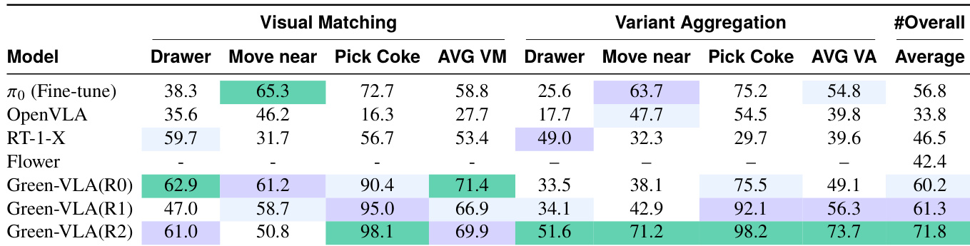 The authors evaluate Green-VLA across training phases R0, R1, and R2, measuring performance on visual matching and variant aggregation tasks. Results show that Green-VLA consistently improves across phases, with R2 achieving the highest overall score, indicating that reinforcement learning alignment enhances both task precision and robustness. The model outperforms baselines like π₀ and OpenVLA, particularly in fine-grained object selection and handling variant conditions.