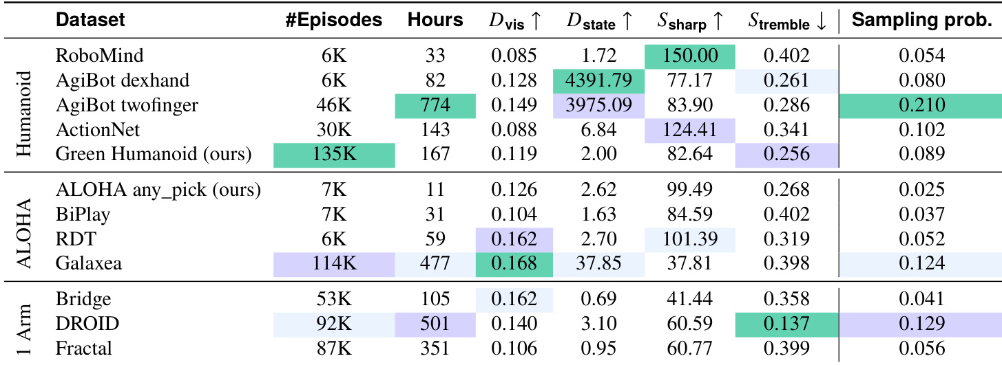 • Mixture ratios are weighted by dataset quality metrics (Table 1). AgiBot twofinger and Galaxea receive highest weights due to size and visual diversity. Droid leads among single-arm datasets for smoothness and task diversity.